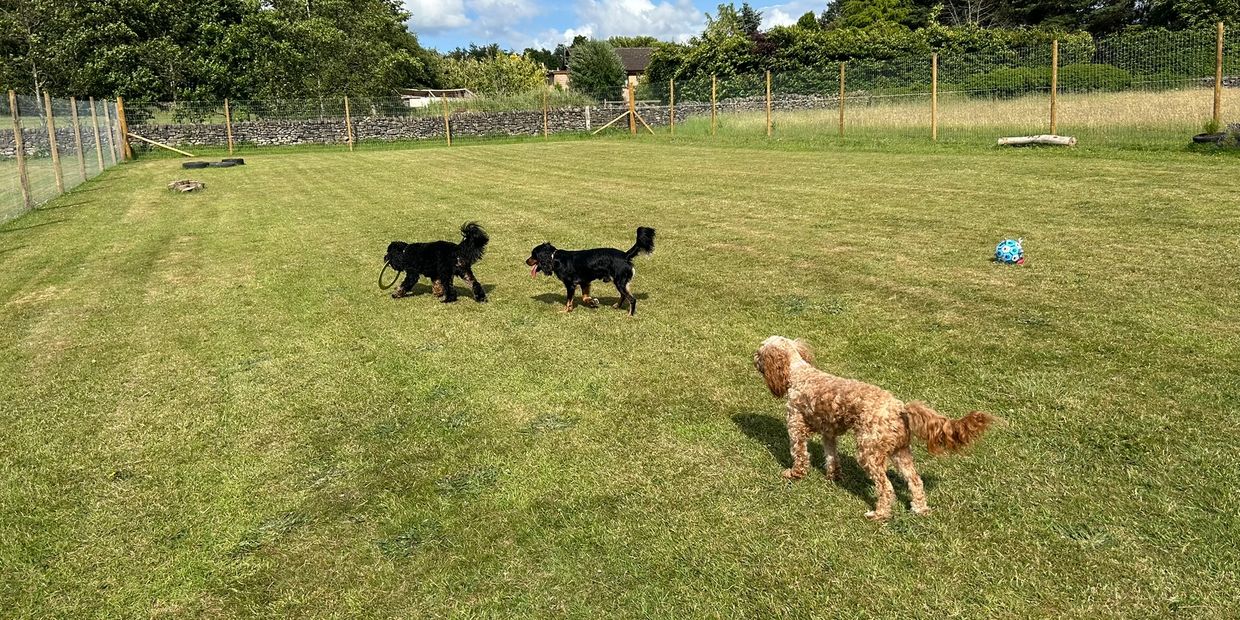 Our secure field has a variety of amenities including natural obstacles, tyres to jump through scent based activites as well as agility obstacles and a large secure area for running off energy.